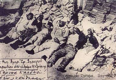 В другом месте он пишет так: «Избиение турками греческого населения заставило меня признаться, что мне стыдно принадлежать человеческому роду. Все это происходило при попустительстве и безразличии иностранных держав, наблюдавших за бойней. Трагическая смерть настигла большое число выдающихся греков Смирны, представителей греческой общины, священников, учителей и старейшин, которые отказались бежать и пали вместе с беззащитным безоружным населением. Вместе с Хризостомом турки уничтожили 347 священников Смирнской епархии из общего числа 459, а также митрополитов Мосхонисийского Амвросия, Кидонийского Григория – погребенного заживо, Иконийского Зилона – зарезанного. Из 46 церквей Смирны сохранилось только три. Никому не удалось узнать, что осталось от растерзанного тела святителя Хризостома. По слухам, тем не менее, тело было похоронено на участке земли, принадлежавшем спортивному обществу Аполлона, а по другой версии – близ одной реки…