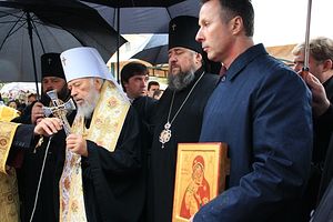 Затем под пение тропаря новопрославленному святому из алтаря была вынесена икона с изображением подвижника и Блаженнейший митрополит Владимир совершил первое молитвенное поклонение перед святым образом святителя Афанасия.