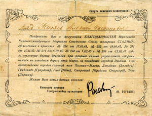 — Да что я понимал тогда, в семнадцать лет? Глупый был. Никакого осмысления не было, да и не до этого там. Знай только, что дадут тебе сухарик, и пойдешь в бой. Ботинки худые, а нам говорят, вот сейчас, мол, город возьмем, и выбирай любые, любой трофей. Из торфяных болот пили. Вода грязная: и мухи, и чего только нет — тряпочку подставишь и пьешь через нее. Очень хотелось живым остаться. Ну, пусть руку оторвет, ногу оторвет, но чтобы прийти домой. А больше ни о чем не страдали. Война есть война.