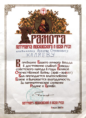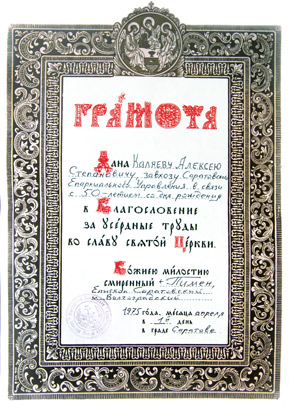 Хозяин этого дома бережно хранит пластинки с записями духовной музыки, подаренные владыкой Пименом. Хранит он и бумагу за подписью архиепископа Пимена, свидетельствующую о том, что он был посвящен в иподиакона 22 апреля 1984 года. Алексей Степанович и сегодня, несмотря на возраст, несет послушание иподиакона в Духосошественском соборе г. Саратова.