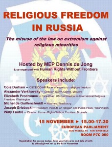 Выступления эксперта ОБСЕ по религиозной свободе К. Дюрхэм, руководителя СОВА-центра А. Верховского, представителя Комиссии США по международной религиозной свободе Э. Продрому, адвоката М. де Гилленшмидта, Ж. Грибоски из Института религии и публичной политики, директора организации «Права человека без границ» В. Футрэ носили критический по отношению к России характер. Выступавшие по большей части заявляли о нарушении вероисповедных прав таких групп, как «Свидетели Иеговы» и сайентологи; с жалобами на российские власти выступали и сами приехавшие в Брюссель представители этих организаций. Многие упоминали в негативном контексте опубликованный на официальном сайте Министерства юстиции Российской Федерации список информационных материалов, которые были признаны экстремистскими. В то же время Э. Продрому признала, что Россия сталкивается с очень серьезными вызовами экстремизма, в том числе на Северном Кавказе.