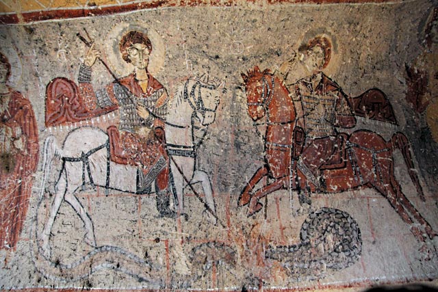 | Фреска в храме Святого Онуфрия, на которой изображены святые великомученики Георгий Победоносец и Феодор Стратилат |