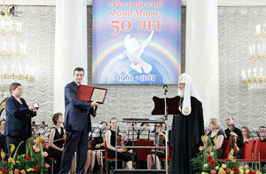 За активную деятельность по духовному возрождению России, большой вклад в развитие миротворчества и межконфессионального диалога юбилейной золотой медалью Российского фонда мира были награждены члены правления РФМ: Святейший Патриарх Кирилл, председатель Совета муфтиев России Равиль Гайнутдин, главный раввин России Адольф Шаевич. Награды вручил председатель правления Российского фонда мира Л.Э. Слуцкий.
