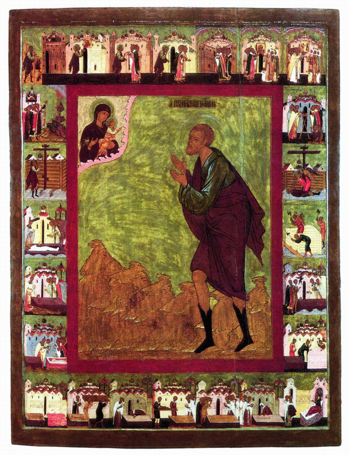 Saint Procopius was a German Catholic. He was running a merchant business in Novgorod when he became enraptured by the beauty of the Orthodox services. He converted into Orthodoxy, gave his wealth and possessions to the indigent and became a monk at the Saint Varlaam-of-Khutyn monastery outside Novgorod. After some time shunning from fame he left for Ustiug where Procopius chose to accomplish the ordeal of God's fool pretending to be a fool in order to attain utmost humbleness and humility. Thus he became the first fool-for-Christ-sake in Russia. He had to go through many afflictions accomplishing this hard feat. Carrying three wooden staffs he walked barefoot and poorly dressed all year round. He slept on church porches or simply on the ground. He would take alms from the compassionate simple people, but he would never accept any charity from the rich, whom he considered obtained their possessions by unrighteous ways; even though this would cause him to go hungry for several days.
