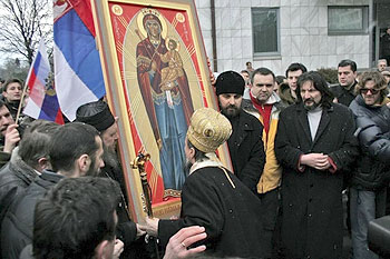 Священнослужители установили икону на руках у ограды. Начался молебен, потом песни, выступления. Затем – крестный ход по Белграду. Когда мы еще подносили икону к площади, вдруг пошел снег, как покровом засыпал все. Но как только установили образ у ограды, снег идти перестал, засияло яркое солнце. Яркое солнце светило и пока шли по Белграду крестным ходом.