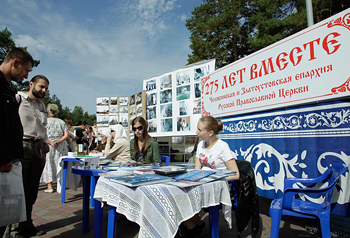 Архиепископ Челябинский и Златоустовский Феофан благословил православную общественность подготовиться к мероприятию серьёзно. Так, экспозиция епархиального управления иллюстрировала все стороны жизни Русской Православной Церкви на Южном Урале. На большой поляне был установлен просторный походный храм, где каждый желающий мог помолиться в тишине, скрывшись от жары и суеты. Неподалёку разместилась выставка книг, изданных в епархии. Затем следовала галерея исторических фотографий, и что более всего привлекало – огромная карта XIX века, на которой были обозначены все храмы того времени.