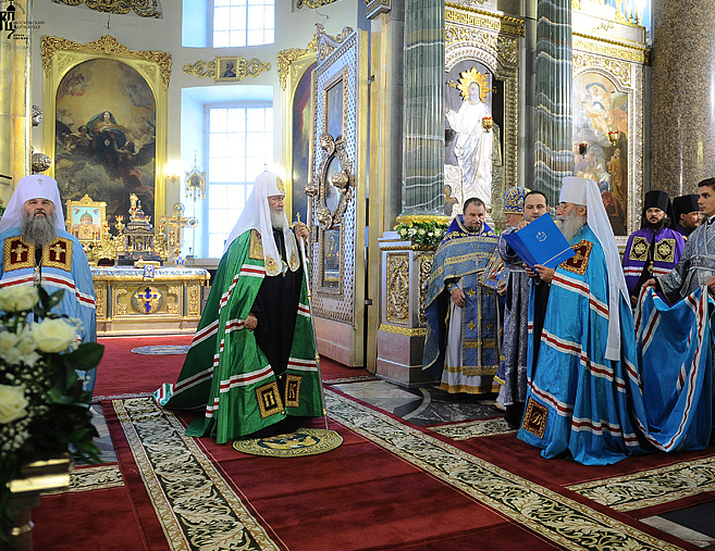 21 сентября Патриарх Кирилл возглавил Божественную Литургию в Казанском соборе. На богослужении присутствовали председатель Конституционного суда РФ В.Д. Зорькин, губернатор Санкт-Петербурга Г.С. Полтавченко, губернатор Ленинградской области В.П. Сердюков, генеральный консул Украины в Санкт-Петербурге Н.В. Прокопович, вице-губернатор М.Э. Осеевский, председатель Законодательного Собрания В.А. Тюльпанов и другие высокие гости. На малом входе Святейший владыка за многолетнее пастырское служение удостоил настоятеля Казанского кафедрального собора протоиерея Павла Красноцветова правом ношения Патриаршего креста. Градоначальник северной столицы Г.С. Полтавченко был удостоен ордена святого благоверного князя Даниила Московского I степени. Предстоятель благословил Г.С. Полтавченко на служение на посту губернатора и преподнес ему Смоленскую икону Божией Матери. «Мы будем не только свято беречь и хранить, но и восстанавливать все святыни Русской Православной Церкви – все святыни нашего красивого, дорогого сердцу каждого из нас города», - заверил губернатор города на Неве.