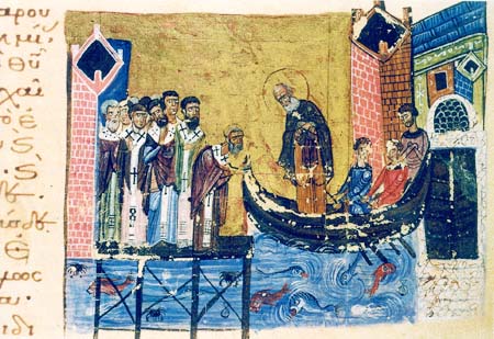 Святитель Григорий Богослов покидает Константинополь. Миниатюра из рукописи XI века Несмотря на уход со столичного Константинопольского престола, одним из самых влиятельных пастырей грекоязычного Востока оставался святитель Григорий Богослов, удалившийся в родной Назианз, где еще жив был его престарелый отец, занимавший епископскую кафедру этого города. После его кончины митрополит Тианский Феодор попросил Григория временно управлять Назианской общиной, которую в ту пору сотрясали споры, возбужденные учением Аполлинария, уже осужденным II Вселенским собором. Вступив в полемику с Аполлинарием, святитель обратился с двумя посланиями к назианскому пресвитеру Каледонию. Когда на кафедру в Назианз был поставлен Евлалий, Григорий Богослов с радостью предался литературным трудам, посещению монашеских обителей Востока, молитве и аскезе. Святитель отошел ко Господу в 389 или 390 году, прожив на земле чуть более 60 лет.