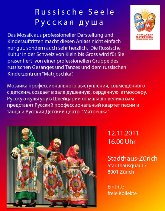 The program opens on November 8 at 19:00 in the Stadhaus with a presentation by the project curator, Dr. of Theology Peter Wittever. On November 12, at Stadthaus Zürich, Stadthausquai 17, a concert will be given entitled, "The Russian Soul"—an exhibit of Russian culture in song and dance, performed by trainees and teachers of dance studios active under the auspices of the "Matreshka" group. An excursion is also organized for Swiss schoolchildren through the world of Russian Orthodoxy, reports the site of the Diocese of Korsun.