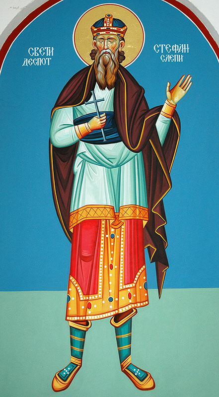 У детињству своме блажени Стефан беше васпитан у сваком добру: стекао је велики разум и побожност, послушност родитељима у свакој њиховој заповести, тако да је вером, мудрошћу и храброшћу многе превазилазио, као и својом природном телесном лепотом. Зато су за њега касније говорили очевидци, који су га већ ослепљеног видели, да је појавом био ,,без приговора, да се не може замислити човек достојанственији од њега, и да је висока раста и ванредно озбиљног и паметног лица". Но најважније особине блаженог Стефана састојаху се у његовој преданости вољи Божјој, чистом животу и верности Цркви и вери Православној.[4] Иако његов живот беше мученички и многострадални, као праведног и многострадалног Јова, он никада не одступи од верности свесветој вољи Божјој, а свагда благодараше Бога за све што га у животу сналажаше. А његова животна страдања не беху мала, као што ће се даље видети. Због тадашњих тешких прилика за хришћане на Балкану и силине турског султана Мурата II, Стефанов отац деспот Ђураћ даде своју ћерку Мару султану за жену, да она, као некада праведна Јудита, буде жртва за спас свога народа и отаџбине. При одласку из престолног града Смедерева за Једрене сестру Мару су пратила браћа Гргур и Стефан, да буду са Маром неко времо заједно и да је тиме донекле теше. Браћа су својим присуством укрепила веру своје сестре, тако да се сестра њихова Мара никада није одрекла ни напустила хришћанску веру, нити примила безбожни ислам. Стефан је потом и надаље остао у Једрену, уствари више као неки талац турском султану, док се Гргур вратио натраг. Но при нападу Турака на престолницу Смедерево и Гргур буде заробљен и одведен у Једрене, где их, по наређењу самог султана Мурата, а без знања сестре им султаније Маре, свирепи Турци обојицу ослепе, на сам Ускрс 1441. године.[5] Као разлог за тако свирепо дело султан је наводио преписку браће са оцем им Ђурђем (који је тада био остао без деспотовине и налазио се у Дубровнику), у којој су они тобоже откривали деспоту Српском тајне Турске царевине. Уствари, главни разлог ослепљења ових српских племића била је турска завист, због њихове лепоте и витештва, и због страха да они не постану наследници и владари Српске земље и државе.