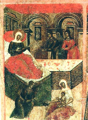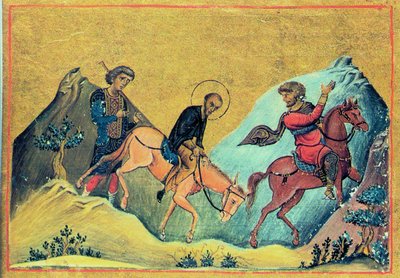 Рождество свт. Иоанна Златоуста. Фрагмент иконы «Свт. Иоанн Златоуст, со сценами рождества и перенесения мощей». Иконописец Феодор Игнатьев. Кон. XVII — нач. XVIII в. (ЯХМ) После кончины матери Анфусы Иоанн оставил родной город и нашел прибежище в монастырях Сирии, потому что мир, принявший Христа, представлялся ему далеко отстоящим от подлинного преображения Евангелием. В пустыне он приобрел аскетический опыт, но и, по словам А.В. Карташева, «нажил себе на всю жизнь тяжелый катар желудка»[2], так что впоследствии мог питаться только рисовой кашей, запивая ее разбавленным вином. В течение двух лет святой Иоанн пребывал в безмолвии, уединившись в пещере.