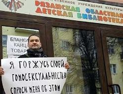 | В марте 2009 года после принятия в Рязани закона о запрете пропаганды гомосексуализма среди несовершеннолетних активисты гей-сообщества устроили акцию, выйдя с плакатами «Я горжусь своей гомосексуальностью» и «Гомосексуализм – это нормально» к рязанским школам и детской библиотеке. |