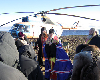 Путешествие началось с вертолетной площадки газовой компрессорной станции-21, находящейся неподалеку от поселка Шексна. Вертолет доставил экспедицию к назначенному месту и совершил посадку на островке желтоватого цвета, полностью состоящем из камней, кирпичей и осколков каменных плит. Ноги паломников ступили на каменный пол храма Похвалы Пресвятой Богородицы. Само здание храма уже не существовало.