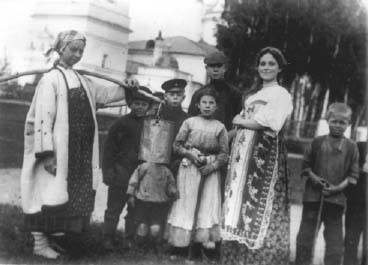 | Капитолина Ивановна Смирнова, Ваня Исаев, Саша Анастасьин, Клавдий Воронцов, Настя Воробьева, за ней — Сергей Есенин, Александра Ивановна Северова, Коля Коновалов. Фото. 1909 г. Село Константиново |