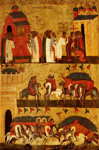 Преподобный предсказал и близкую смерть самому племяннику великого князя Василия II Темного – его заклятому врагу князю Димитрию Шемяке. Еще ранее, в феврале 1446 года, Василия по приказанию Димитрия захватили в Троице-Сергиевом монастыре и затем ослепили (после чего тот и стал называться «Темным»). Михаил и ранее, во время пребывания Шемяки в Новгороде, обличал его: «Довольно бед натворил ты в земле Русской к радости врагов ее; если и теперь воздвигнешь междоусобие, со стыдом возвратишься сюда, а здесь готовы для тебя три локтя земли»[9]. После же очередной попытки свержения Василия Темного, завершившейся бегством Шемяки в Новгород, блаженный Михаил «сказал закоренелому крамольнику: “Слышу, князь, земля простонала три раза и зовет тебя к себе”…»[10]. Гневными словами юродствовавшего инока сама Церковь обличала клятвопреступника, когда-то «целовавшего крест» в знак примирения с Василием, но ставшего разорителем гражданских устоев зарождавшейся тогда российской государственности. Вскоре Шемяка, действительно, скончался, отравленный собственным поваром.