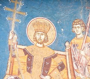 Четвертый Вселенский собор. Император Маркиан. Фрагмент фрески из монастыря Высокие Дечаны 25 октября в Халкидон прибыли император Маркиан и августа Пульхерия в сопровождении высших чинов и сенаторов. Они торжественно вошли в храм святой Евфимии, и там император произнес перед отцами собора речь, вначале на латинском языке, а потом в переводе на греческий. Ее он закончил словами: «Наша тихость заботится, чтобы все народы, имея одну и ту же мысль о Божественном, чтили истинное и кафолическое богослужение и веру, которую вы изложите им по переданным от святых отцов догматам. Итак, да будет делом вашего благочестия, чтобы, как на святейшем соборе отцов в Никее явленная вера освободила людей от заблуждений, а изданная в свет сделалась всем известною, подобно и ныне все сомнительное, явившееся в это непродолжительное время, как мы сказали, по развращению и корыстолюбию некоторых, единодушно было отсечено, а определенное вами сохранялось бы вечно. Делом же Божественного Промысла будет, чтобы то, о чем мы стараемся с благочестивым намерением, всегда твердо соблюдалось на пользу при вашем содействии»[1]. Раздались приветственные аккламации: «Маркиану, новому Константину, (многая лета)! Императору многая лета! Многая лета августе!»