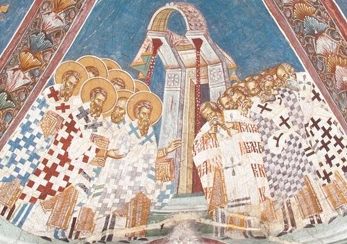 Четвертый Вселенский собор. Отцы православной Церкви и еретики; Балканы. Сербия. Дечаны; XIV в.; местонахождение: Сербия. Косово. Монастырь Высокие Дечаны. Нартекс В 6-м правиле сформулирован один из важнейших принципов, относящихся к поставлению клириков, – запрет абсолютных рукоположений, не связанных с назначением на определенное место служения. 15-е правило касается поставления диаконисс. В нем установлен возрастной ценз для их посвящения – 40 лет. В этом правиле предусмотрено также тяжкое прещение для диакониссы, вступившей в брак, – предание и ее, и вступившего с ней в брак лица анафеме. Такое наказание является явным доказательством того, что диакониссы не принадлежали к числу клириков, поскольку наказанием для клириков было не отлучение от церковного общения, но извержение из сана. С исчезновением чина диаконисс правило, естественно, перестало применяться по своему буквальному смыслу. Но оно содержит в себе некий экклезиологический принцип, который не утратил практического значения в связи с исчезновением института, о котором в правиле идет речь. Например, оно может служить отправной точкой в рассуждении церковной власти об установлении возрастного ценза для назначения женщин на какие-либо церковные должности.