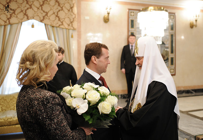 Фото: Патриархия.ru 1 февраля 2012 года в Патриаршей и Синодальной резиденции в Даниловом монастыре Президент Российской Федерации Д.А. Медведев с супругой С.В. Медведевой поздравили Святейшего Патриарха Московского и всея Руси Кирилла с третьей годовщиной интронизации.