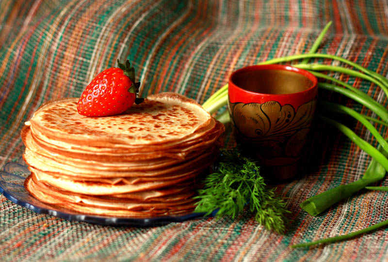 И не забудьте про блины с припеком. На горячую сковороду сначала выкладывается «припек» – это может быть зеленый или репчатый лук, ягоды, кусочки рыбы, кусочки яблок, моркови, других овощей и фруктов. Сверху наливается тесто и обжаривается с двух сторон.