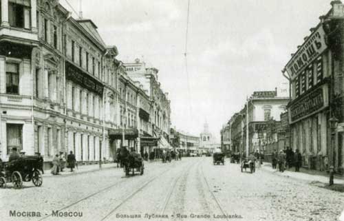 | Вид на улицу Большая Лубянка от Варсонофьевского переулка в сторону Бульварного кольца (1900-е гг.). Изд. П.Фон-Гиргенсон. |