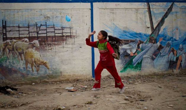 In photo taken Sunday, March 11, 2012 A Pakistani Christian girl plays with a balloon next to a wall with biblical paintings at the Christian colony in the center of Islamabad, Pakistan. Roughly five percent of Pakistan's 180 million people belong to minority religions, which include Hindu, Christian, Shiite Muslims and Ahmedis, according to the CIA World Factbook. (Anja Niedringhaus / AP)