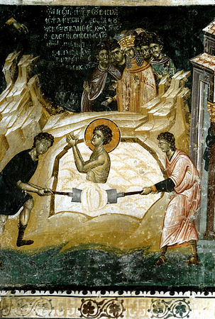 Refusing to renounce the faith, the tribune George was imprisoned and then cruelly tortured. First, he was placed in stocks and a large weight was placed on his chest. This must surely have broken some of his ribs, leaving him in great pain. Then he was tied to a wheel which was turned around, but underneath the wheel there were great nails sticking up from a board. These must have torn his skin from him. Then he was buried up to his head and left for three days. Finally, he was given poison. However, despite all these tortures, George not only survived, but was also miraculously healed, his unceasing prayer giving him the strength to defy his torturers. Seeing his courage, two soldiers, Anatolius and Protoleon, a priest, the governor and others, were converted to the faith. Not only they, but also the Emperor's wife, the Empress Alexandra. Thus, it was that they too were all martyred, being commemorated today, and George was beheaded.