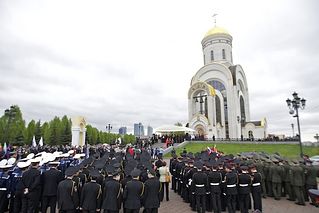После праздничной литургии в храме Георгия Победоносца, которую возглавил Святейший Патриарх Кирилл, и крестного хода, ребята прошли торжественным маршем перед ветеранами войны и возложили цветы к вечному огню у музея Великой Отечественной войны на Поклонной горе.