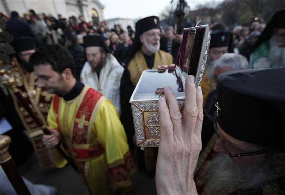 A Bulgarian East-Orthodox priest holds up a box containing bones, believed to be the relics of John the Baptist, in front golden-domed “Alexander Nevski” cathedral in Sofia, November 12, 2010. The bones, discovered earlier this year in excavation works in the town of Sozopol on the Black Sea coast, will be displayed in “Alexander Nevski” cathedral for several days. REUTERS/Oleg Popov