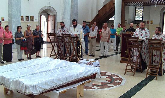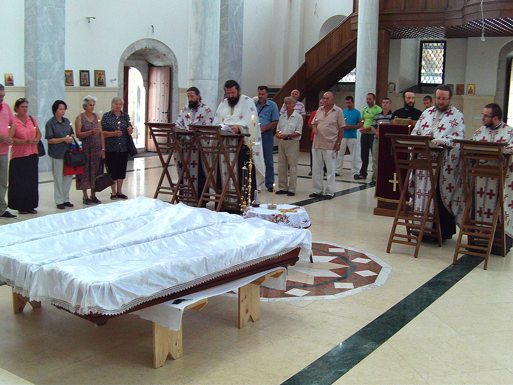 -Окупили смо се данас овде, у овом храму, који је и сам пострадао и васкрсао, да би смо испратили у вечни покој кости постаралих слугу божјих, суграђана наших, браће и сестара наших Чедомира ,Олге и Јелене и са њима заједно да се сетимо свих оних који у овоме граду пострадаше, само због тога што су исповедали веру православну, страдајући за крст часни и слободу златну као и многи други који су пострадали на Косову и Метохији. И заиста, као што смо чули у прелепим текстовима које Православна црква вековима чува и пева приликом испраћаја својих ближњих, смрт телесна је само привремени растанак, тело се распада и одлази у прах и пепео, али човек остаје да живи у Господу и чекајући васкрсење мртвих када ће заједно сви они који су живели у Христу, са Христом, кроз Христа, васкрснути у Царству Небесном. И зато се молимо да и ове слуге божје који су својим животом потврдили своју љубав служећи и овоме храму и служећи Богословији, служећи Богу на разне начине , да им Господ да вечни покој да уђу у месту цветном, у месту прохладном, где нема ни туге ни уздисаја, да чекајући свесвети дан, страшни дан Христовог васкрсења буду достојни да стану са десне стране његове заједно са свима праведницима и многима онима који у овоме граду угодише Богу од његовог настанка до данас, чија имена само Бог зна. Нека би Господ представљеним слугама својим и свима онима чија имена не знамо и којима се не зна где су сахрањени, нека би их се Господ сетио и примио их у своје Царство молитвама Цркве своје свете, а нама свима нека нас Господ укрепи да наставимо да носимо наш крст на Косову и Метохији, сведочећи Бога живота, Бога истине, који је победио сваку смрт, лаж и свако зло и укрепио нас да изнесемо свој подвиг до краја, да би се сви ми када за то дође време удостојили заједно са свима светима да вечно славимо име Оца и Сина и Светога Духа.“