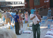 В. Хаусов: Когда мы приехали, раздача гуманитарной помощи еще не была организованной. К сожалению, находились среди местного населения те, кто жили в соседнем с храмом многоэтажном доме, который от наводнения не пострадал, и буквально «хапали» и растаскивали то, что предназначалось потерпевшим бедствие людям. Находились и те, кто просто хотел воспользоваться ситуацией в коммерческих интересах. Бывали случаи, когда товары гуманитарной помощи оказывались в местных кафе и торговых киосках. Поэтому основная задача состояла в том, чтобы организовать работу по оказанию помощи так, чтобы она доходила до действительно пострадавших и нуждающихся людей.