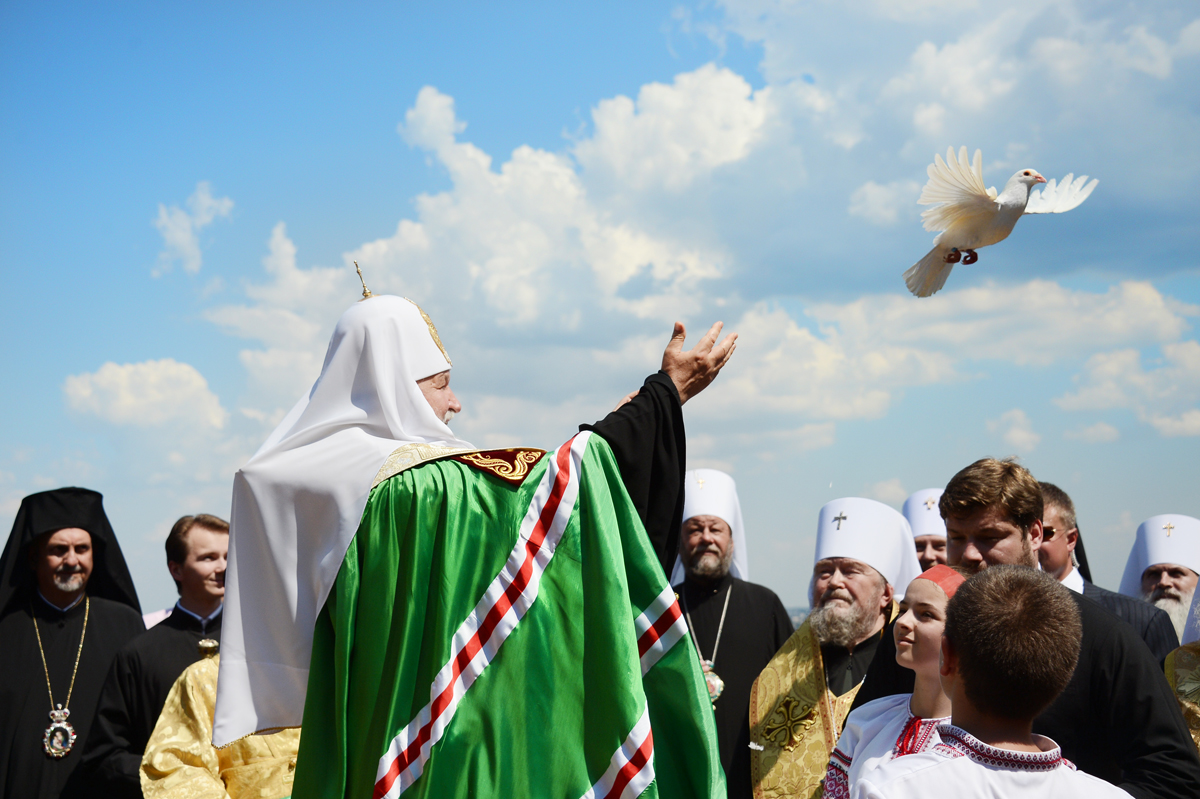 Затем Святейший Патриарх выпустил голубей, принесенных к памятнику украинской молодежью.