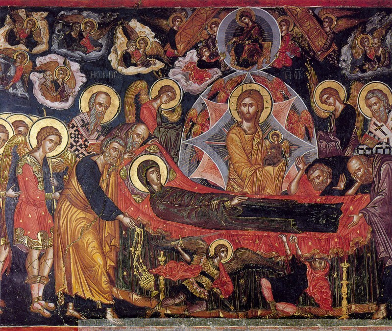 А која је реч у стању да објасни оно што се десило после неизрецивог рођења? Јер, Она Која је помогла и која је састрадавала умањењу Логоса Божијег Који је из ње рођен, и слави се заједно с Њим, узноси се достојно додајући величанственост дивној величанствености. Али и по узласку на Небо Онога Који је од Ње оваплоћен, Она по величанствености која превазилази ум и реч, као да се такмичила с Њим разноврсним подвизима и молитвама, као и бригом за цео свет, охрабрењем проповедника на свим крајевима земље; и уопште, Она је свима била једини ослонац и утеха, на све начине помажући у доношењу јеванђељске радосне вести и јасно показујући Саму Себе и живот пун борбе и владавину над умом и речју. Зато је, наравно, живоносна Њена смрт, која је води у Небески и бесмртни живот; и сећање на Њу је радостан празник и светковина целог света. Богоносни дух Приснодјеве у Своје руке је примио Њен Син; Он је, мало касније, и ово рођено тело преселио у вечну и Небеску обитељ. Све је то праведно и сасвим долично. Заиста, многи су се од искона удоствојили Божије благонаклоности, славе и моћи, као што и Давид каже: „како су ми недокучиве помисли Твоје, Боже! Како им је велик број. Да их бројим, више их је него песка“ (Пс. 139, 17-18). „Многе су жене, - по Соломону, - биле врсне, али ти их надвисујеш све“ (Прич. 31, 30). Ова – Пречиста Дјева се и узнела над свима и изнад свега. Она је једина, ставши између Бога и људског рода, Бога учинила Сином човека, а људе је учинила синовима Божјим; Она је учинила земљу небом и обоготворила људски род; Она је једина од свих превазилазећи сваку природу била Мајка Бога по природи, а кроз неизрециво рођење је постала царица сваке твари на свету и изнад света и узносећи се тако над Онима који су јој потчињени кроз Њу Саму и постајала је и Сама учесница у највишем избрању кроз Божански Дух, Она је највиша од преузнесених и најблаженија Царица блаженог рода. А данас, Она Којој доликује да живи на небесима, као у палати која јој приличи, у коју се данас преселила са земље и стала с десне стране Сведржитеља „сва је украшена изнутра, хаљина јој је златом искићена“ (Пс. 44, 13), како је о Њој рекао Псалмопојац и пророк. Под позлаћеном одећом подразумевај Њено боголепно тело искићено различитим врлинама: јер, Она данас једина заједно са Сином у богопрослављеном телу има небеско обитавалиште, јер земља, гроб и смрт нису имали власти да задрже до краја живоначално и богопријемно тело, боље обитавалиште од неба и од небеса над небесима. И заиста, ако се душа која има благодат Божију која у њој обитава, остављајући земаљско, узноси ка небу, као што је то постало јасно из мноштва примера и ми у то верујемо, како је могло да не буде узнесено са земље на небо тело, које не само да је примило у себе Јединородног и Предвечног Сина Божијег, неизрециви извор благодати, већ и које Га је родило и показало? Како би постала прах подвргнут трулежности Она Која је још као трогодишњакиња и још немајући у Себи Наднебесног Који Се у Њу уселио, Која још није родила Оваплоћеног, обитавала у Светињи над светињама? Зато се и природно тело које је родило прославља богодоличном славом (заједно) с Рођеним и саваскрсава се, по пророчанској песми, заједно с Христом Који је раније васкрсао после три дана, „кивот светиње“ Његове (Пс. 132, 8). Постојао је и доказ Њеног васкрсења из мртвих за апостоле – плаштан