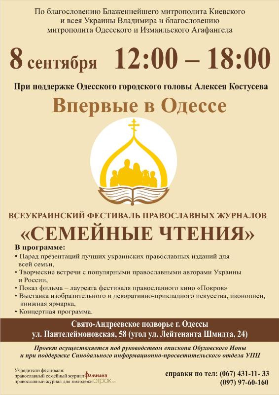 Свои издания готовы представить в Одессе учредители фестиваля «Семейные чтения» – православный журнал для молодежи «Отрок.ua» и православный семейный журнал «Фамилия», а также православный журнал для сомневающихся «Фома в Украине», женский православный журнал «Самарянка» и детские журналы «Капельки» и «Шишкин лес». В преддверии фестиваля каждый из журналов готовит к выходу в свет свежий номер, так что даже постоянным читателям православных изданий «Семейные чтения» в Одессе принесут много новых и ярких впечатлений.