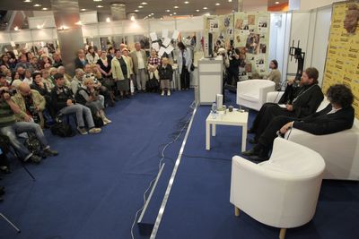 На презентацию собралась самая разнокалиберная публика: писатели, виртуальные книготорговцы, боссы от книжных издательств, здесь же затесались и с десяток студентов Сретенской семинарии. Поболеть за своего ректора пришли. Замечаю, что наряду с вполне приветливыми взглядами и приглашениями присоединиться к фуршету в их сторону была адресована, например, и такая веселенькая реплика: «Слушай, кто там с этим попом? Какие отвратительно русские лица!» Студенты, слегка удивлённые, возражать не стали. Но в целом обстановка была вполне доброжелательной.