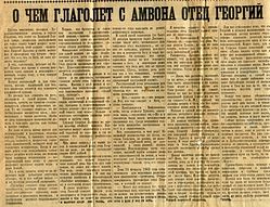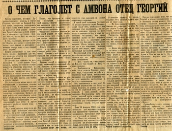 Чушь? Да; но ведь тогда она воспринималась как норма, и очень, очень многими — как правда. Более того: если мы найдем в себе силы вслушаться в этот безумный треск повнимательнее, мы поймем, что это не просто лобовая атака, это утонченная стратегия. Цель публикации «О чем глаголет с амвона…» — поссорить священника с его же паствой, с прихожанами. Перетянуть некую сомневающуюся, «небезнадежную», «не до конца потерянную» часть прихода Духосошественской церкви на сторону «советского народа». Для того-то и начинается этот текст так странно: «Группа верующих, посещающих Духосошественскую церковь… попросила (кого она попросила?! — Авт.) растолковать, почему настоятель этой церкви священник Георгий Лысенко в своих молитвах и проповедях так упорно твердит…» — а далее проводится мысль, что сомневающиеся, не дающие себя обманывать прихожане настоятелю неугодны.