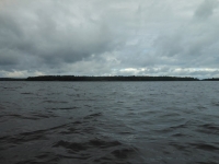 Пытаемся пройти вглубь острова - но крапива и кусты малины стоят сплошной стеной, выше головы. Возле берёз лежит несколько полусгнивших брёвен - вот и всё, что осталось от большого дома, где всегда было много детей. Мы возвращаемся в лодку, и наш кормчий, Александр Леонидович, поднимает тяжёлые самодельные вёсла.