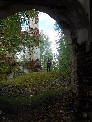 Когда рядом с Белозерском снимали фильм «Калина красная», Василий Шукшин выбрал для «натуры» деревню с такими вот развалинами храма. «Поруганная церковь, без креста, фоном будет объяснять не только Егора Проскудина, а нацию - собирательно», - сказал Шукшин.
