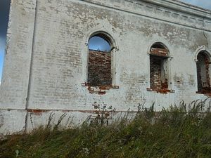 Распознать среди руин алтарь действительно не так просто. Расшатанные кирпичи похожи на стариковские зубы, и, когда входишь под своды храма, хочется прикрыть голову руками. На месте иконостаса висит покосившаяся рама от большой иконы, а вот другого «убранства» не сохранилось. Рядом с храмом стоит обезглавленная колокольня - но кажется, что при сильном порыве ветра она рухнет на землю.