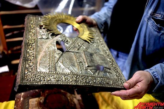Кирилл показывает несколько икон, с которыми ещё предстоит работать: потемневшие, в копоти, трещинах, с отколами и царапинами. Трудно поверить, что это вообще подлежит восстановлению.
