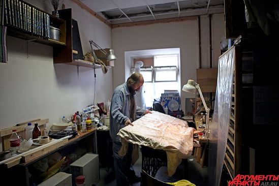 Бывшие «ночлежки» из горьковского «На дне» принадлежат храму, в котором и работает художник. Лабиринты узких коридоров и переходов, чуть обшарпанные стены, тусклый свет, сильный запах воска и ладана. Кажется, что им пропитано всё здание.