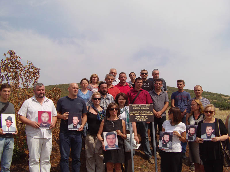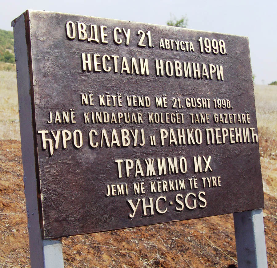 Новинари Ђуро Славуј и Ранко Перенић су последњи пут виђени 21.августа 1998. године. Тога дана су из Велике Хоче кренули да направе репортажу о повратку монаха у манастир Свети Врачи Козма и Дамјан у Зочишту, после киднаповања од стране шиптарских терориста и интервенције Међународног Црвеног Крста. Од тога дана до данашњег, породице нису сазнале шта је са њима. Трагање траје пуних 14 година, а резултата нема. Идеја УНСа да се постави плоча је начин да се скрене пажња и да се прозову сви они који су одговорни због њиховог нестанка.