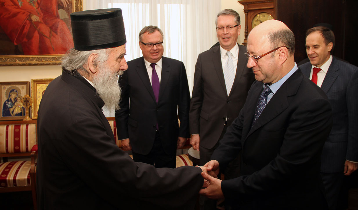 Његова Светост Патријарх српски г. Иринеј примио је данас у Патријаршији српској у Београду председника ВТБ Банке г. Андреја Костина, генералног директора Урал Вагон Завода г. Олега Сиенка, као и Његову Екселенцију Александра Чепурина, амбасадора Руске Федерације у Београду.