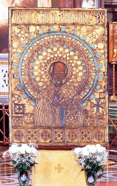- Икона святителя Николая из города Бари, которая находится в нижнем, Преображенском храме с правой стороны, у придела Алексия человека Божия. Этот образ сделан итальянским художником в 1994 году. Я не случайно употребляю именно это слово – «сделан» – потому что икона выполнена в достаточно редкой технике и не просто написана красками, но и содержит в себе аппликации из полудрагоценных камней.
