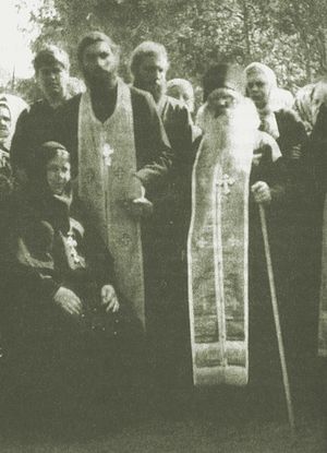 | Архимандрит Павел, игумения Варвара, священство и народ. Владимир Белов стоит крайний слева |