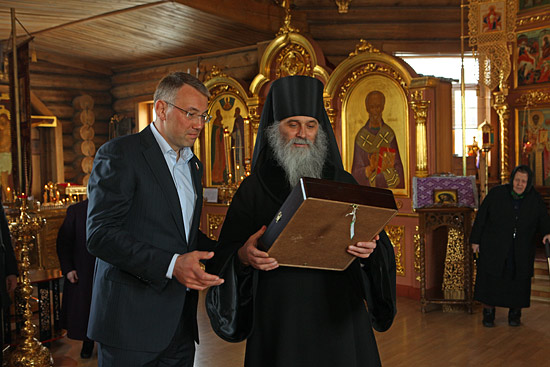 | Сенатор от Ненецкого округа Игорь Кошин передает епископу Иакову икону месточтимого святого Никодима. Фото: Альберт Людвиг. |