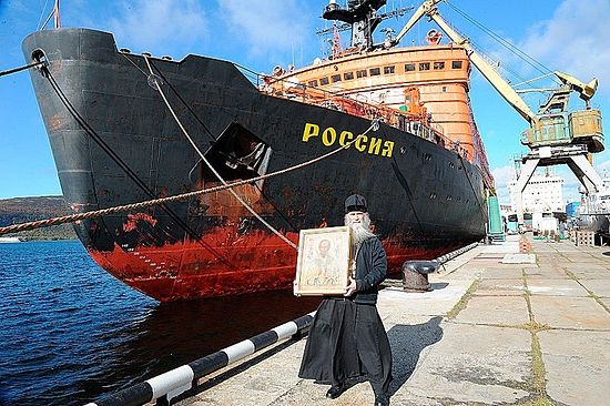 Преосвященный Иаков, епископ Нарьян-Марский и Мезенский с образом святителя Николая у борта атомохода «Россия»