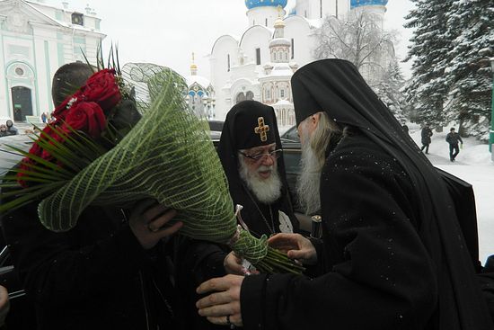 У Троицкого собора Лавры Святейшего и Блаженнейшего Католикоса-Патриарха всея Грузии Илию II и делегацию Грузинской Православной Церкви встречали наместник обители архиепископ Сергиево-Посадский Феогност и председатель Учебного комитета Русской Православной Церкви, ректор Московской духовной академии и семинарии архиепископ Верейский Евгений, братия обители.
