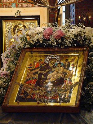Это список с чудотворного образа, написанный на Святой Горе Афон братией Ватопедского монастыря специально для московского Новоспасского монастыря в 1995 году. Икону раз в месяц приносят в храм онкологического института им. Герцена, пациентов которого окормляет община обители. Все прихожане Новоспасского монастыря очень любят молиться перед этой иконой и даже говорят о многочисленных случаях исцелений от тяжких заболеваний по молитвам к Богородице.