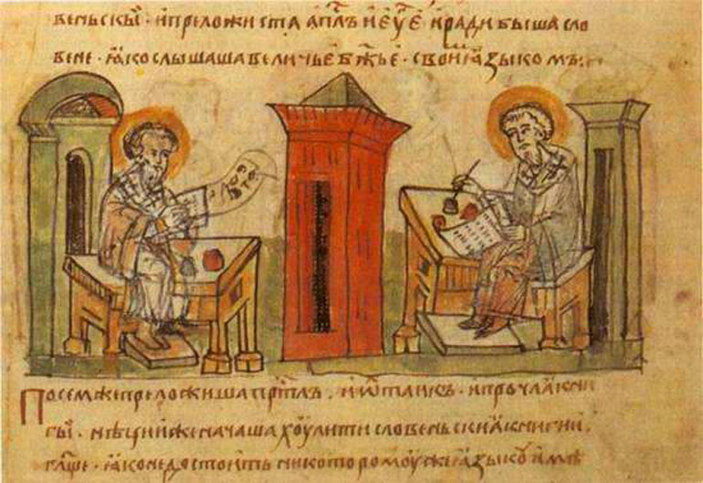 | Кирилл и Мефодий пишут азбуку - миниатюра из Радзивилловской летописи (XIII в.) |