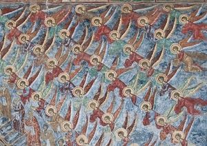 Конечно, в такой перспективе существовала опасность представления о том, что ангельские силы едва ли не собезначальны Богу, но святые Отцы властно пресекали ее возможность. Святитель Амвросий Медиоланский пишет: «Ангелы, господства и власти, хотя и прияли некогда свое начало, однако же уже существовали, когда сотворен был сей мир»[2]. Святые отцы отрицали также какое-либо соучастие ангелов в творении. Именно поэтому некоторые из них допускали, что ангелы были сотворены в процессе создания мира. Такого мнения держался, в частности, блаженный Феодорит. Он считал, что ангелы сотворены одновременно с созданием вещественного мира, т. к., согласно его утверждению, они «ограничены местом», т. е. пространством. Последнее же возникло в то же время, что и вещественный мир. Однако блаженный Феодорит не настаивает на своем мнении. «Говорю же сие, — пишет он, — не утвердительно, ибо смелым признаю утверждать решительно, о чем не говорит в точных словах Божественное Писание»[3].
